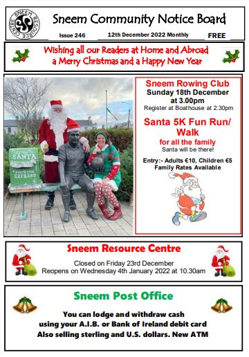 The January issue of the Sneem Community Notice Board celebrates the new year with a photo of the fireworks display on the front cover. Inside are photos from the Senior Citizen’s Christmas Party, the Santa Fun Run and reports from the local schools.