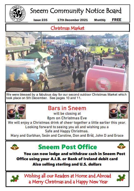 The Christmas issue of the Sneem Community Notice Board features the hugely successful outdoor Christmas Market on the front cover. All the local businesses have taken out ads wishing their customers a Happy Christmas and New Year.