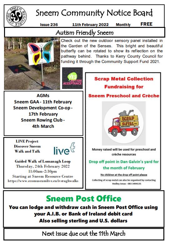 After the lifting of most of the Covid restrictions, Sneem is getting back to normal with AGMs and events planned. There are reports for the local primary schools, Sneem Digital Hub, the Autism Friendly Sneem project and Story House Feasibility Study and more