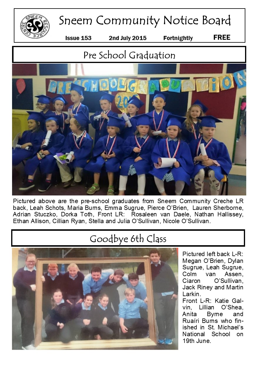 Issue 153 features Sneem Community Creche pre-school graduation and St. Michael’s National School 6th class as term ends and summer holidays begin.