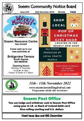 The November issue of Sneem Community Notice Board features the winner of the GAA lotto on the front cover. Inside there are photos and reports of the Scarecrows on the Green and other Halloween festivities. The programme for the upcoming Sneem International Storytelling and Folklore Festival is printed on the centre pages.