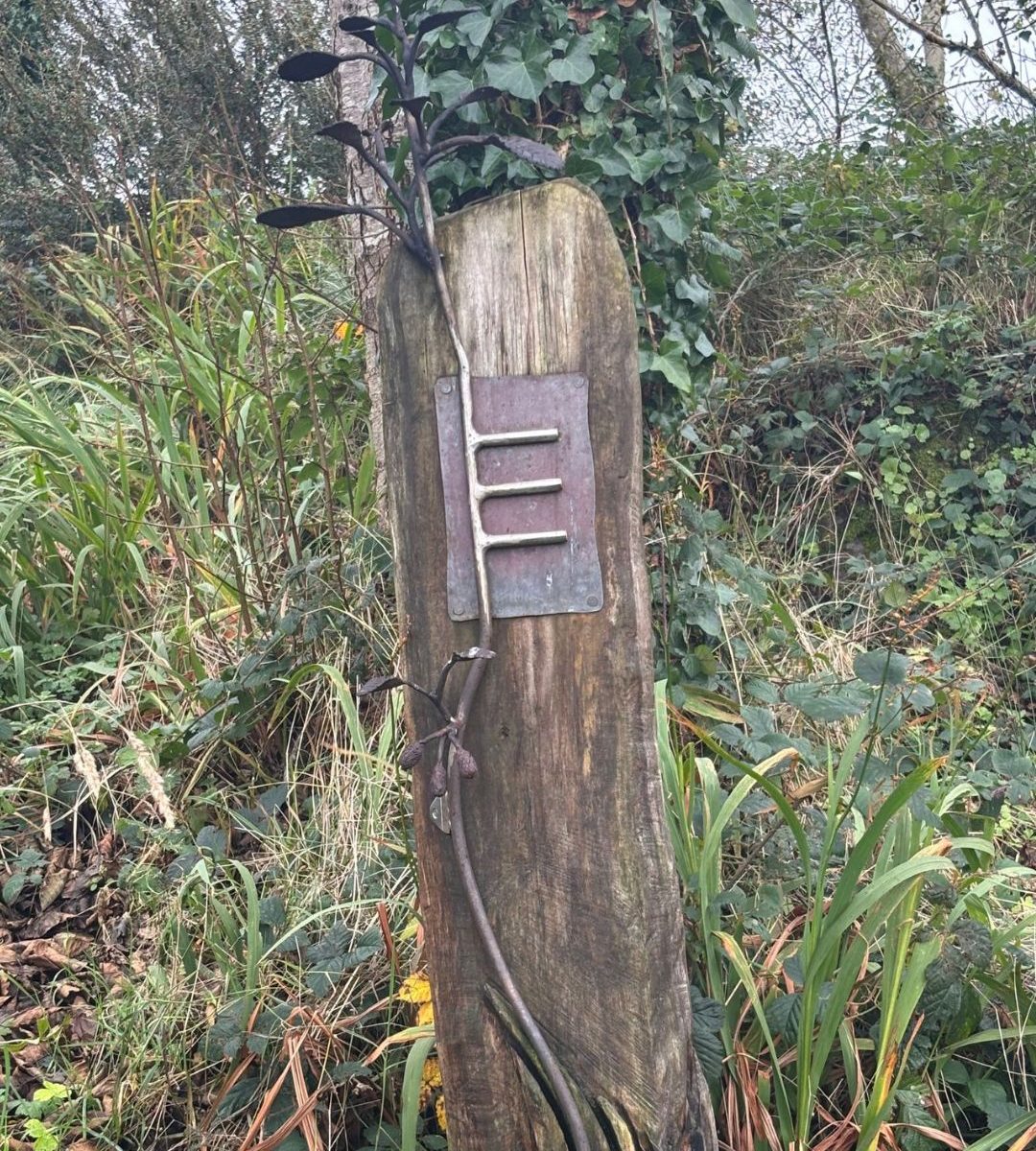 We began this trail in 2023 by erecting an Alder sculpture in the Wild Garden. A piece of local alder was found and carved by local woodworker Adrian Cauldwell, the ironwork designed and created by local blacksmith, Tom Allison and the graphics and signage completed by arts graduate, Ella Allison. This graphic introduces the Alder sculpture