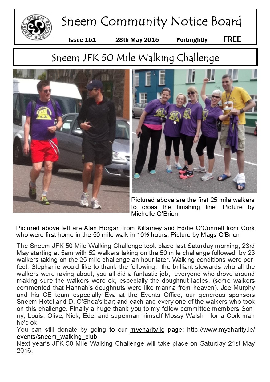 Report and photos of the Sneem JFK 50 Mile Challenge feature in this issue.