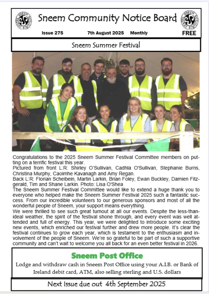 The August edition features the Sneem Summer Festival Committee on the front page celebrating a fabulous festival in July. Inside are reports from various clubs and news of upcoming events.